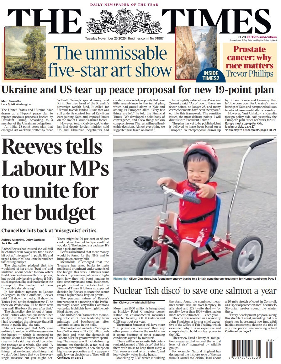 Rachel Reeves is urging Labour MPs to “unite for her Budget” and hitting out at what she calls “misogynist critics”, says The Times. But a plan to introduce a council tax surcharge on properties worth more than £2m could turn into a “sticking plaster” and it’s a “mansion tax”, says The i Paper. “Any more Vlad apples, Nige?” asks The Mirror, as Reform leader Nigel Farage faces “mounting pressure to investigate pro-Putin links” in the party after the jailing of Nathan Gill for taking pro-Russian bribes. Meanwhile, US and Ukrainian negotiators drafted an incomplete peace proposal in Geneva, which “leaves big calls to presidents”, says the Financial Times.