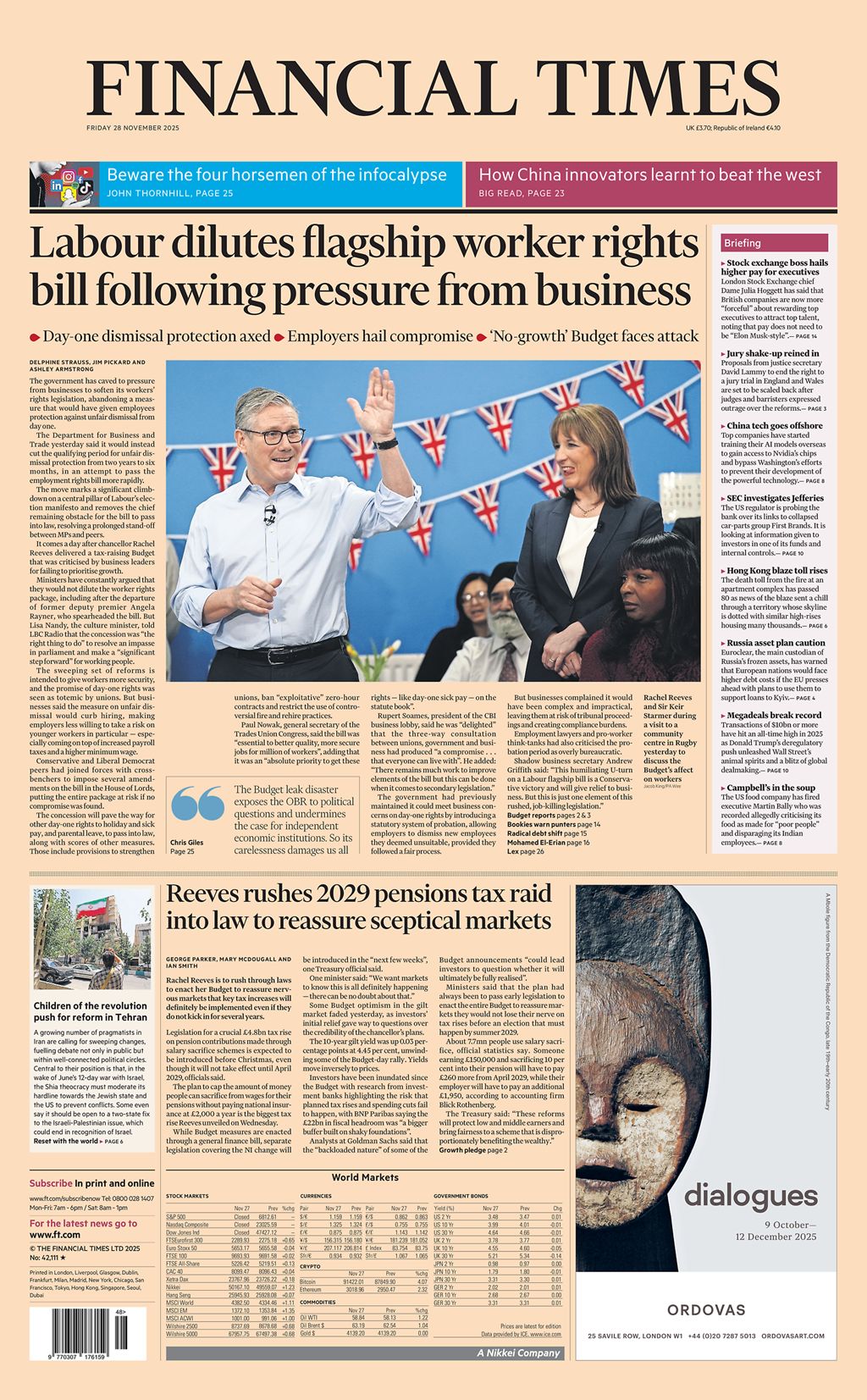 Labour has “caved to pressure from businesses to soften its workers’ rights legislation”, says the Financial Times. After the government dropped unfair dismissal safeguards for new employees on the first day of a new job, The Telegraph said it was the “second manifesto breach in as many days”. Peers’ amendments opposing the original assisted dying bill are “stealing precious time and choice”, says the Daily Express, while The Mirror reports on a potential fresh lead in the Jill Dando murder. Investigators are probing “a newly unearthed picture” of what the tabloid claims is “a Serbian assassin”.