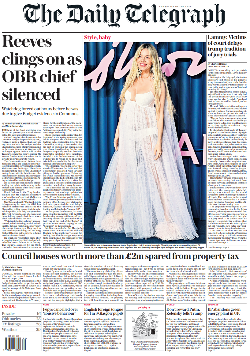 “Reeves clings on as OBR chief silenced”, says The Telegraph after the resignation of the Office for Budget Responsibility chair. Richard Hughes was “forced out” after “contradicting” the Chancellor”, says The i Paper, and the Daily Mail says he became “the fall guy for Reeves’ Budget lies”. The Daily Mirror wants “justice for the lost victims” of the Post Office Horizon scandal. It says the police could press corporate manslaughter charges in cases where staff took their own lives after being accused of theft due to a faulty IT system.