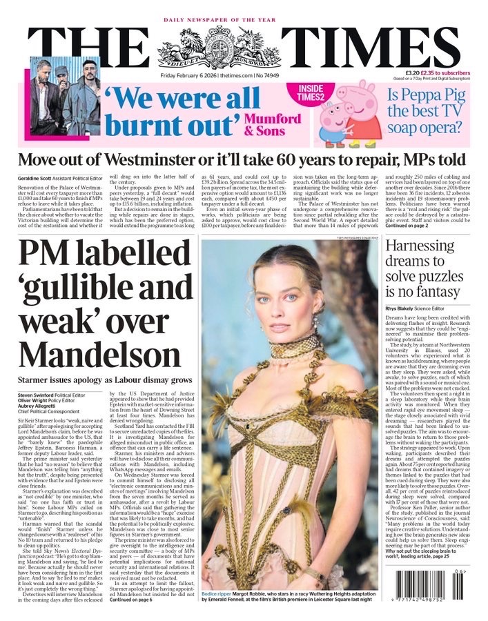 Keir Starmer has been labelled “gullible and weak” following his apology regarding the appointment of Peter Mandelson, says The Times. “Keir and present danger”, is The Mirror’s headline, noting that the PM faces a “growing Labour rebellion”. Angela Rayner is “primed to strike”, says the Daily Mail, but her “tilt at No 10” has been “hit by a tax inquiry”, says The Telegraph. Meanwhile, after 36 days of rain, the Met Office has issued warnings of “yet more bad weather”, The Independent says.