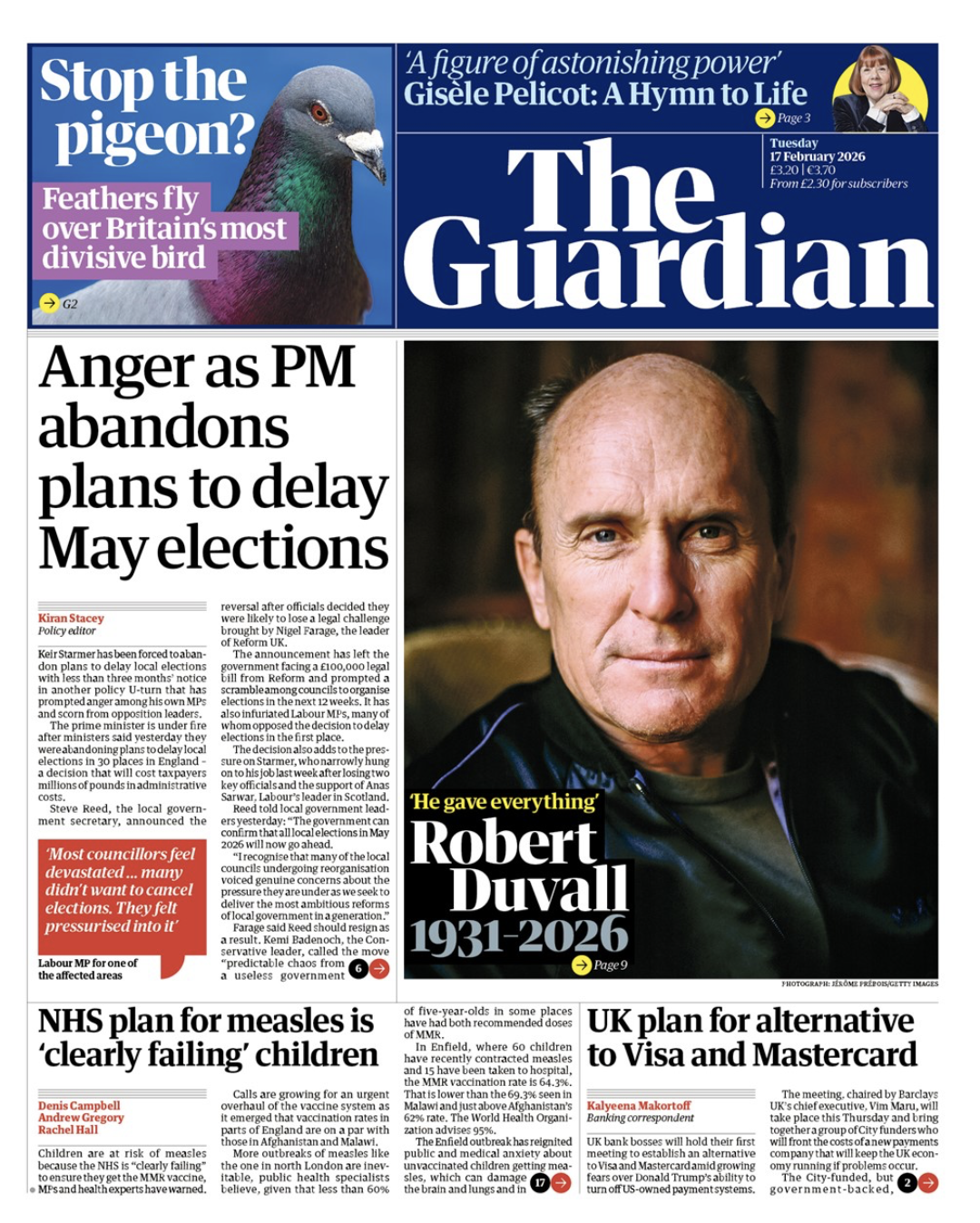“Anger as PM abandons plans to delay May elections”, says The Guardian. The government dropped plans to delay 30 council elections following a legal challenge from Reform UK. “Starmer forced to face wrath of voters”, says the Daily Mail. “Starmer U-turns on cancelled elections”, says The Telegraph. “Robert Duval dies at 95”, the Daily Star reports. A grieving mother has called for immediate action on social media reforms to “save our next generation”, says The Mirror. “China greets lunar new year”, says the Financial Times. Meanwhile, The Times reports on “Iranian war games”.
