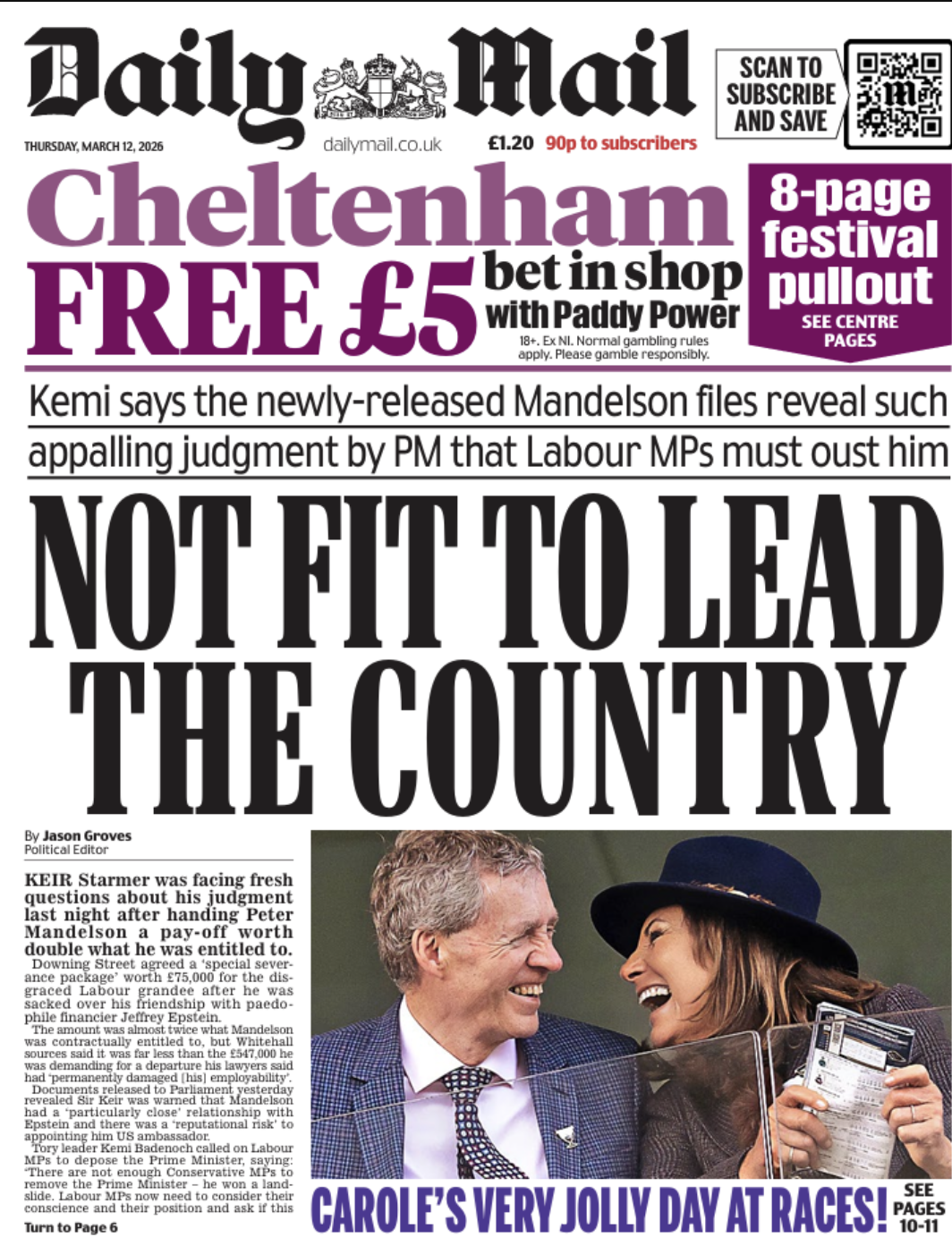 Keir Starmer is “not fit to lead the country”, says the Daily Mail, after the Mandelson files release revealed his “appalling judgement”. “Starmer ignored top aides” when he appointed Mandelson as Britain’s ambassador to the US, says The Telegraph. “Sacked in scandal but Mandelson wanted £500k to walk away”, says Metro. Iran is ramping up its “war of attrition”, says The Guardian. The world is scrambling to “calm oil markets” after ships were attacked in the Gulf, says The i Paper.