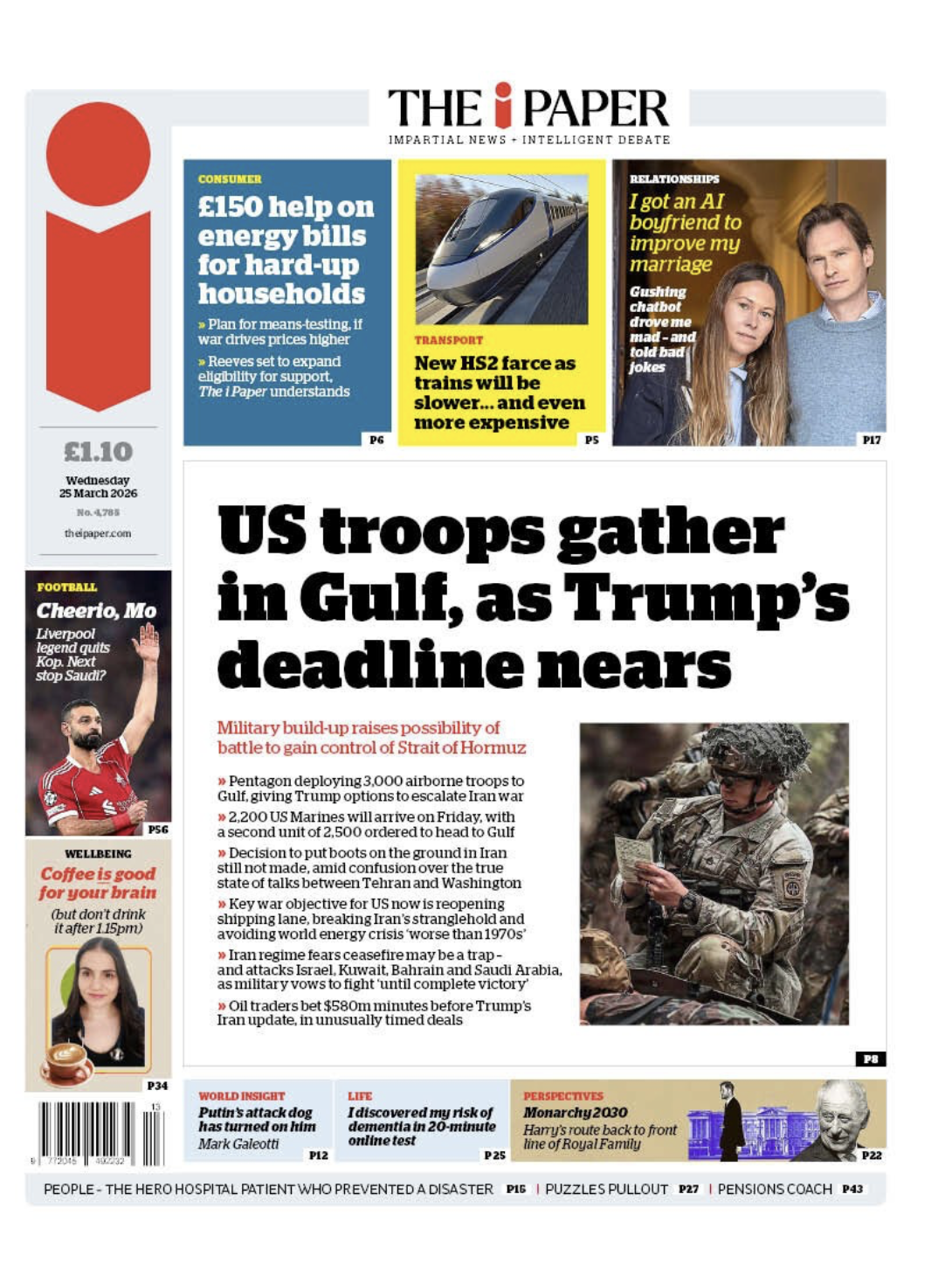 Some 3,000 airborne troops are gathering in the Gulf, says The i Paper, but the “decision to put boots on the ground in Iran” is still undecided. The elite paratroopers are “poised to go to the Gulf”, The Guardian says. “UK drivers hit with £307m fuel bill after Trump’s Iran war”, says The Independent. Volkswagen is in talks with Israel’s Iron Dome maker to “shift from cars to defence”, the Financial Times claims. “Strictly no Baftas”, says The Sun, after the reality show was “sensationally snubbed” and failed to land a single nomination at this year’s Baftas.