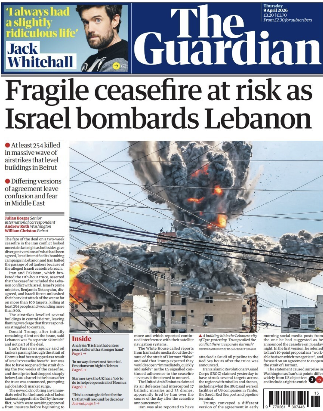 The “fragile ceasefire” is “at risk” as Israel “bombards Lebanon”, says The Guardian. The “airstrikes” risk “blowing the fragile ceasefire apart”, says The Times. “And still it goes on”, The Mirror says. The two-week ceasefire is “a bizarre kind of victory”, says the Daily Mail, but it’s “oil over bar the shouting”, Metro says.